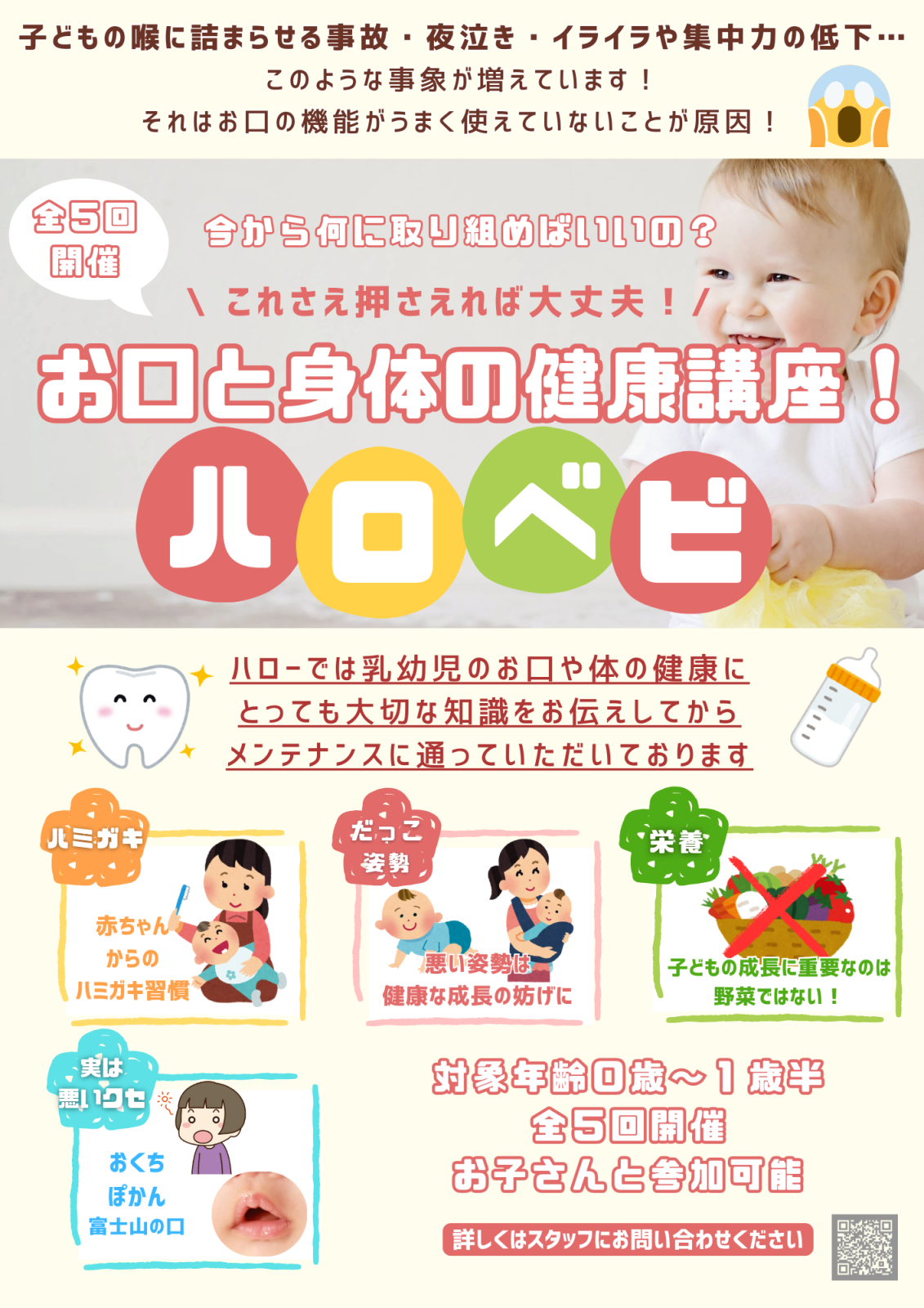初診が済んだ0歳~1歳6カ月の親子を対象に「お口と身体の健康講座」(通称ハロベビ)を開催しています!