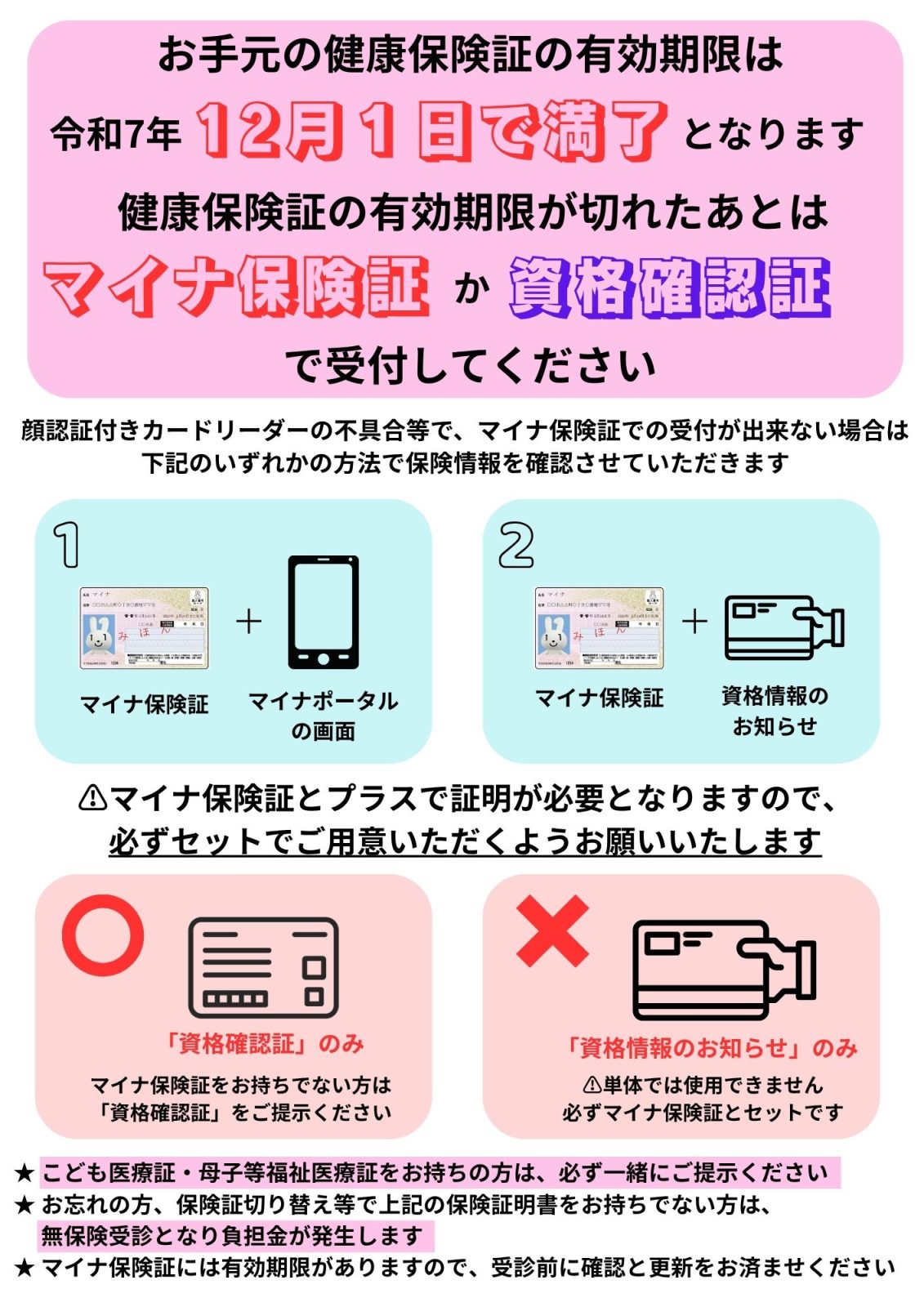 今までお使いの健康保険証は12/2以降お使いいただけませんので、【マイナ保険証】か【資格確認証】のどちらかをご持参いただき、受診くださいませ。